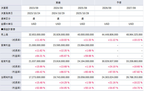 クレジットカードでおなじみのVISA、200以上の国と地域で消費者、企業、銀行、政府機関に高速かつ安全で信頼性の高い電子決済を提供する世界的な決済技術企業です。業績予想は、かなり正確なことが多く、信憑性があります。