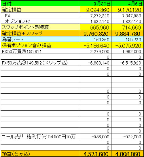 確定利益+スワップ合計が9,884,780円、含み損益込みだと4,808,860円です。